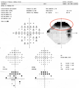 Na maior parte dos casos, pacientes com glaucoma são da mesma faixa etária dos pacientes com catarata. A presença de catarata significativa pode levar a defeitos difusos no gráfico Total Deviation, levando a falsa impressão de defeitos glaucomatosos. Por isso a importância de se avaliar o gráfico Pattern Deviation, que anula o efeito da redução geral da sensibilidade e evita que defeitos localizados sejam mascarados.